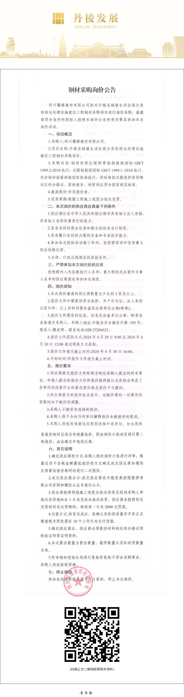 丹棱縣城鎮(zhèn)生活垃圾分類收轉(zhuǎn)運處理設(shè)施建設(shè)工程鋼材采購項目詢價公告