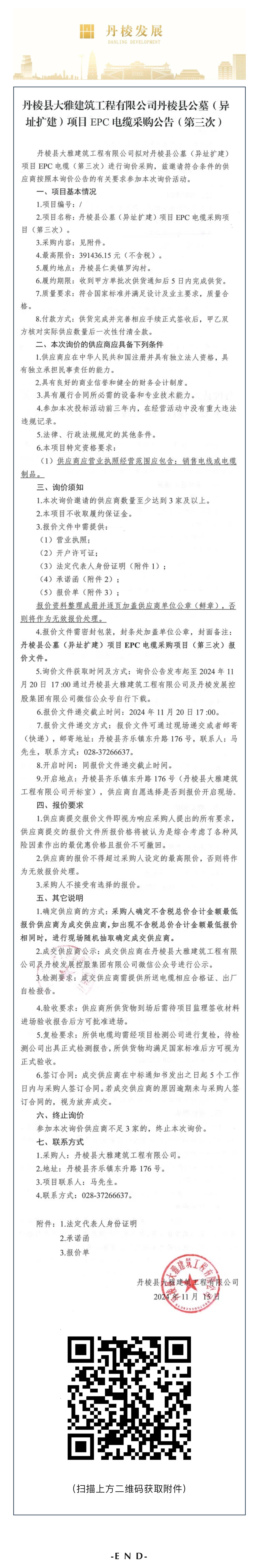 丹棱縣大雅建筑工程有限公司丹棱縣公墓(異址擴(kuò)建)項目EPC電纜采購公告(第三次)