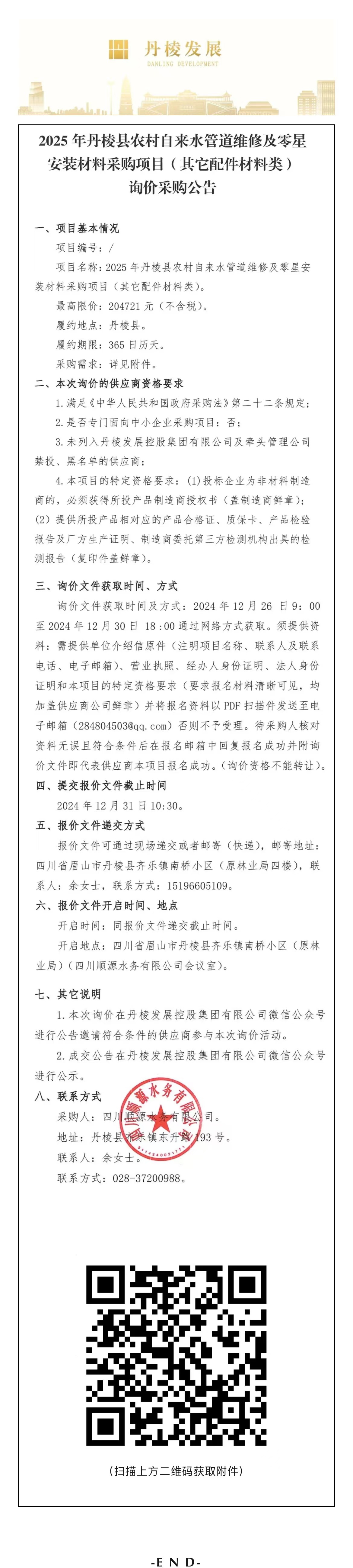 2025年丹棱縣農(nóng)村自來水管道維修及零星安裝材料采購項(xiàng)目(其他配件材料類)詢價(jià)采購公告