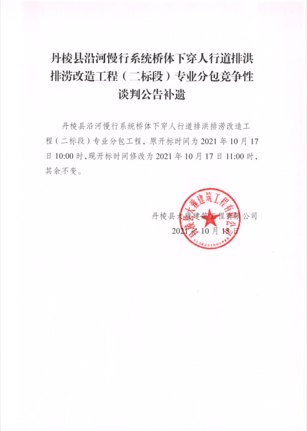 【大雅建筑公司】丹棱縣沿河慢行系統(tǒng)橋體下穿人行道排洪排澇改造工程(二標(biāo)段)專業(yè)分包競爭性談判公告補(bǔ)遺