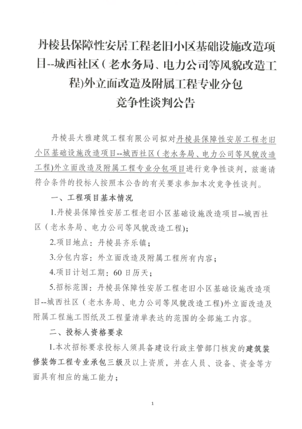 【大雅建筑公司】丹棱縣保障性安居工程老舊小區(qū)基礎(chǔ)設(shè)施改造項(xiàng)目--城西社區(qū)(老水務(wù)局、電力公司等風(fēng)貌改造工程)外立面改造及附屬工程專業(yè)分包競(jìng)爭(zhēng)性談判公告