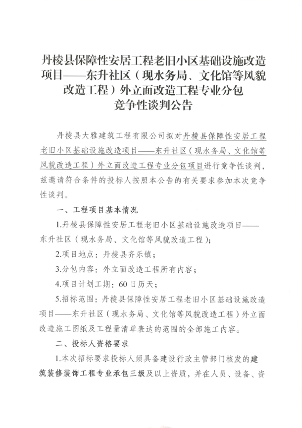 【大雅建筑公司】丹棱縣保障性安居工程老舊小區(qū)基礎(chǔ)設(shè)施改造項目--東升社區(qū)(現(xiàn)水務局、文化館等風貌改造工程)外立面改造工程專業(yè)分包競爭性談判公告
