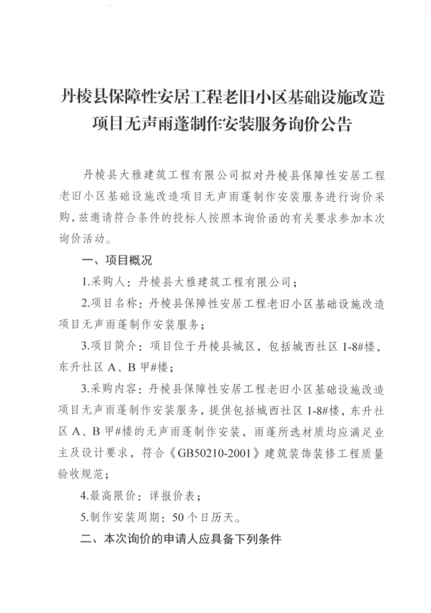 【大雅建筑公司】丹棱縣保障性安居工程老舊小區(qū)基礎設施改造項目無聲雨蓬制作安裝服務詢價公告