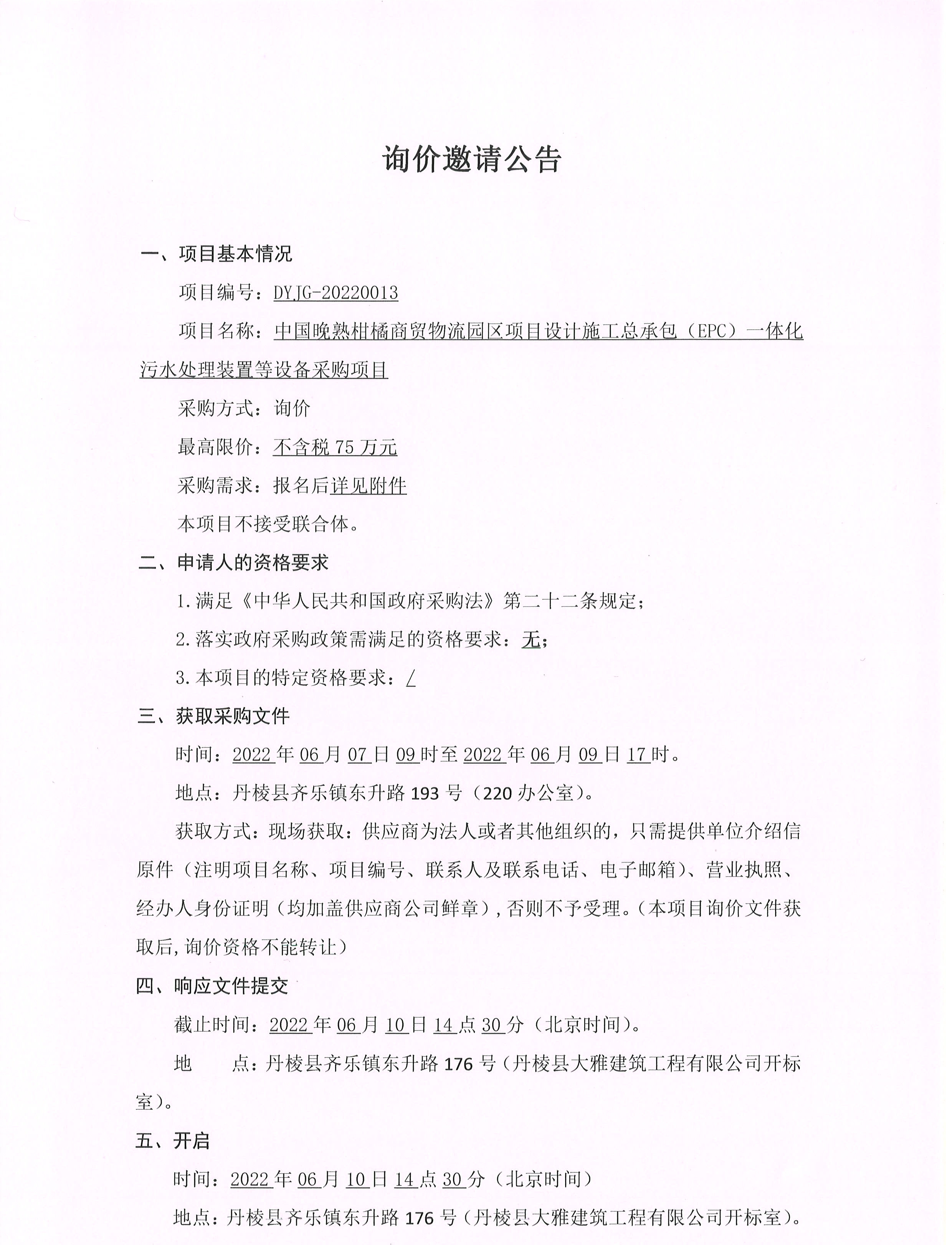 中國晚熟柑橘商貿物流園區(qū)項目設計施工總承包(EPC) 體化污水處理裝置等設備采購項目詢價邀請公告