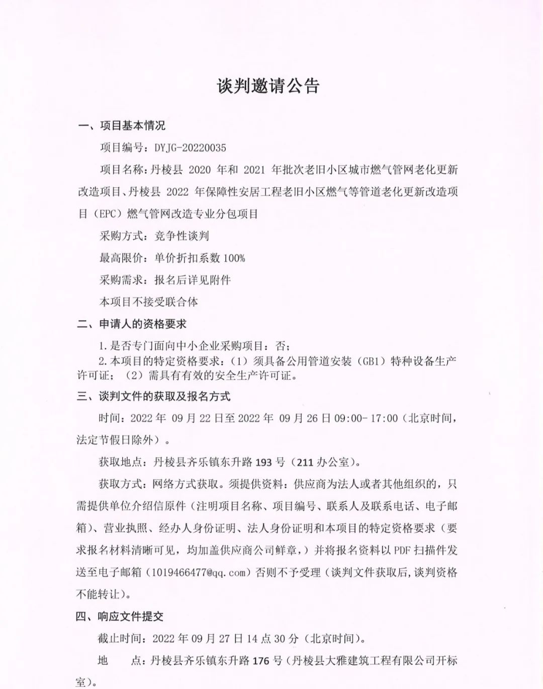 丹棱縣 2020 年、2021年及2022年批次老舊小區(qū)城市燃氣管網(wǎng)老化更新改造項目燃氣管網(wǎng)改造專業(yè)分包項目談判邀請公告