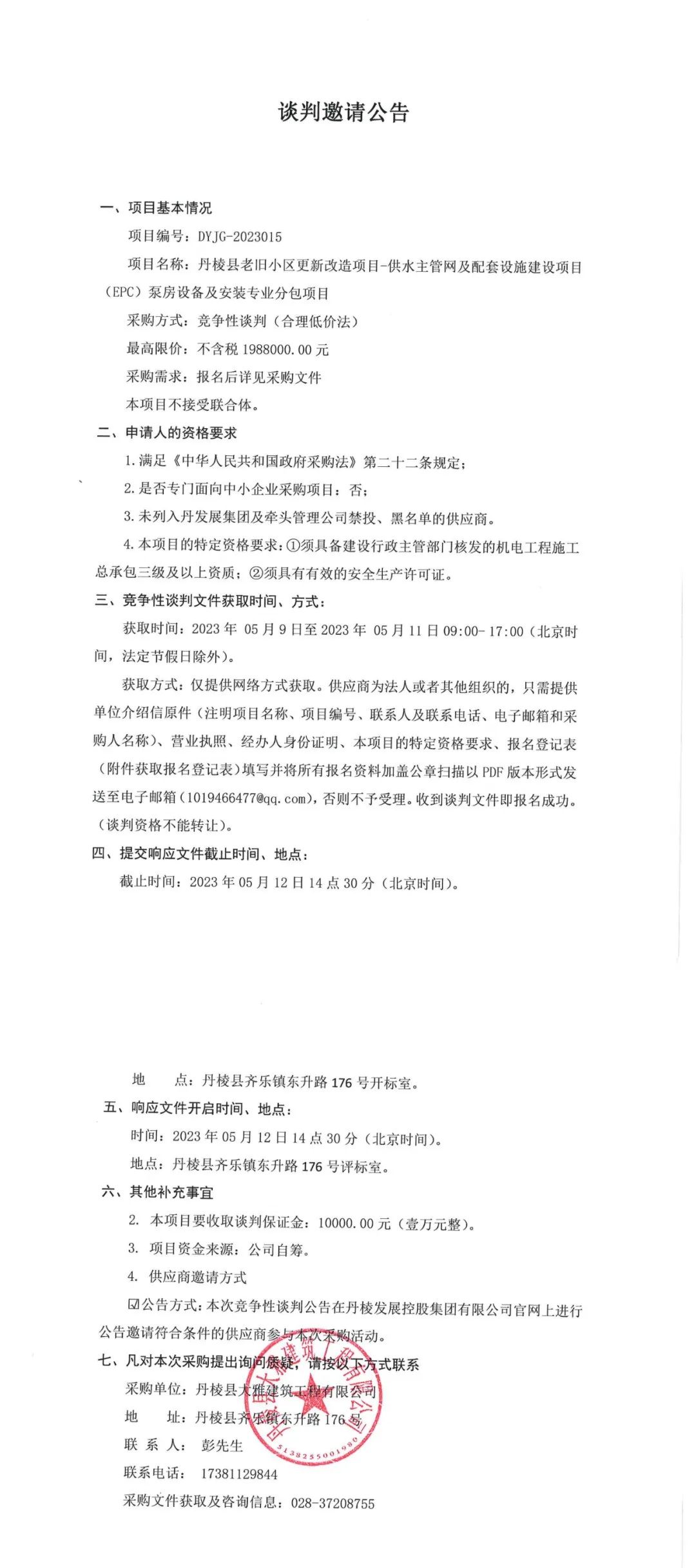 丹棱縣老舊小區(qū)更新改造項目-供水主管網及配套設施建設項目(EPC)泵房設備及安裝專業(yè)分包項目談判邀請公告
