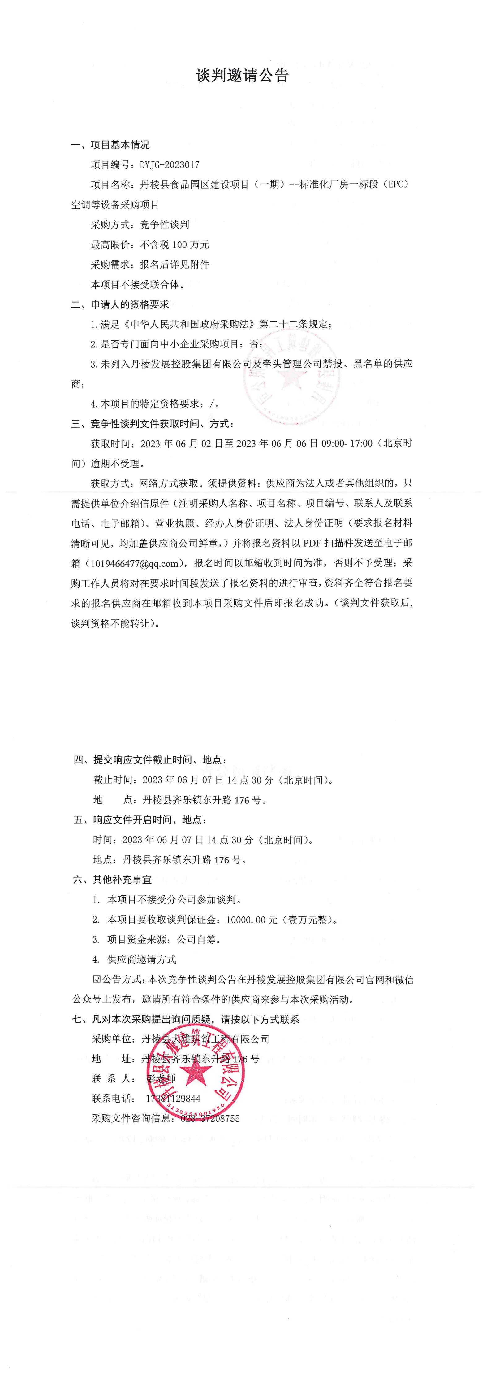 丹棱縣食品園區(qū)建設(shè)項目(一期)--標(biāo)準(zhǔn)化廠房一標(biāo)段(EPC)空調(diào)等設(shè)備采購項目談判邀請公告