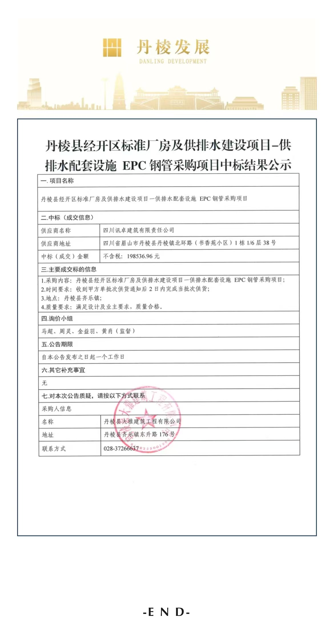 丹棱縣經(jīng)開(kāi)區(qū)標(biāo)準(zhǔn)廠房及供排水建設(shè)項(xiàng)目——供排水配套設(shè)施EPC鋼管采購(gòu)項(xiàng)目中標(biāo)結(jié)果公示