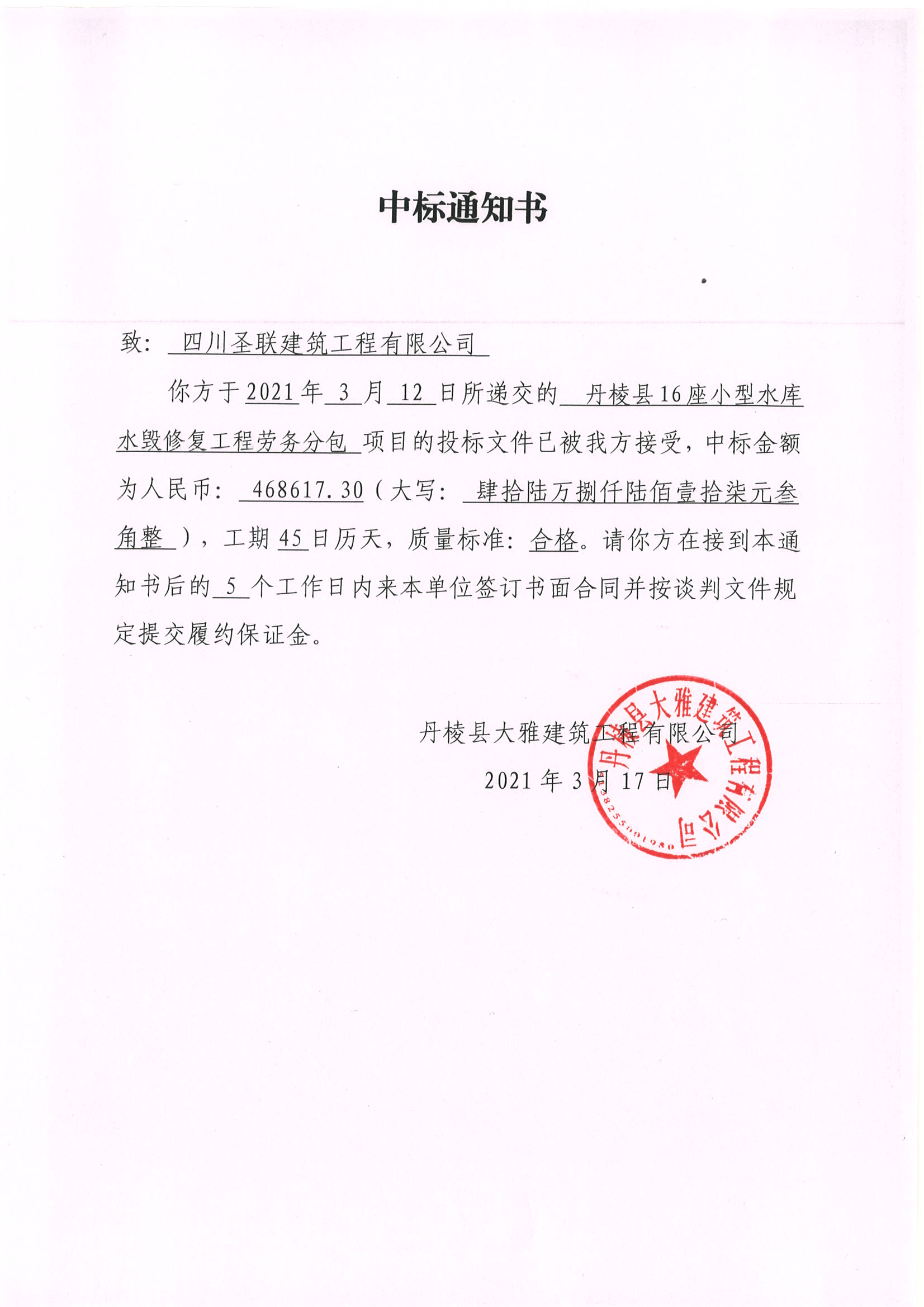 【大雅建筑公司】丹棱縣16座小型水庫(kù)水毀修復(fù)工程勞務(wù)分包中標(biāo)成交公告