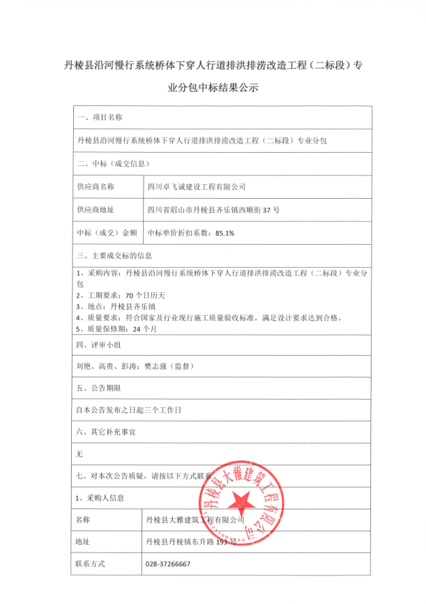 【大雅建筑公司】丹棱縣沿河慢行系統(tǒng)橋體下穿人行道排洪排澇改造工程(二標(biāo)段)專業(yè)分包中標(biāo)結(jié)果公示
