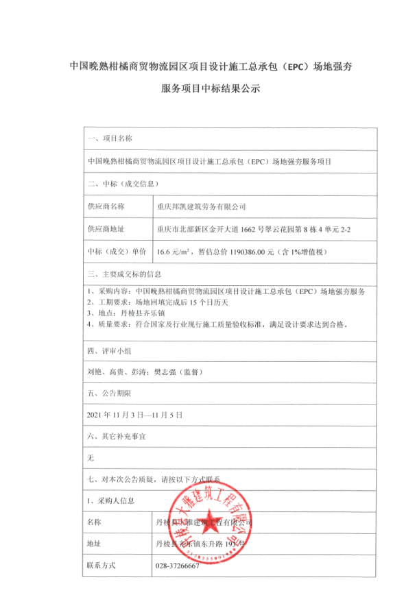 【大雅建筑公司】中國(guó)晚熟柑橘商貿(mào)物流園區(qū)項(xiàng)目設(shè)計(jì)施工總承包(EPC)場(chǎng)地強(qiáng)夯服務(wù)項(xiàng)目中標(biāo)結(jié)果公示