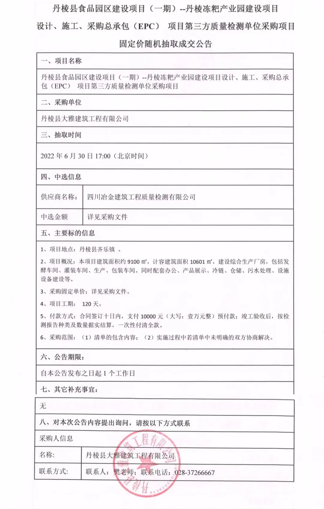 丹棱凍粑產(chǎn)業(yè)園建設項目設計、施工、采購總承包(EPC)項目第三方質(zhì)量檢測單位采購項目固定價隨機抽取成交公告
