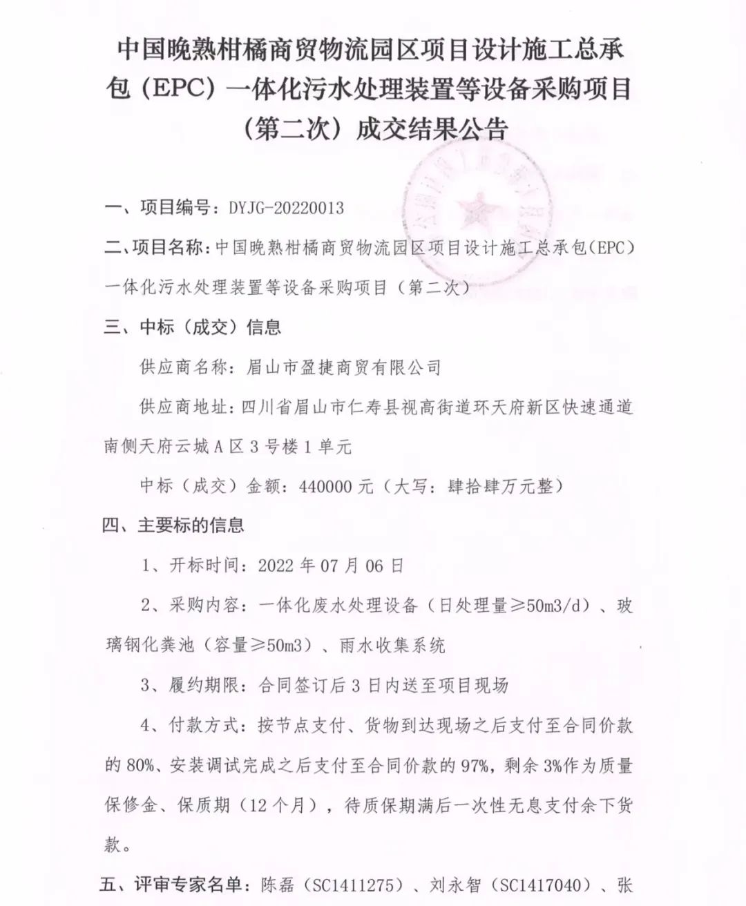 中國晚熟柑橘商貿(mào)物流園區(qū)項目設計施工總承包(EPC)一體化污水處理裝置等設備采購項目(第二次)成交結(jié)果公告