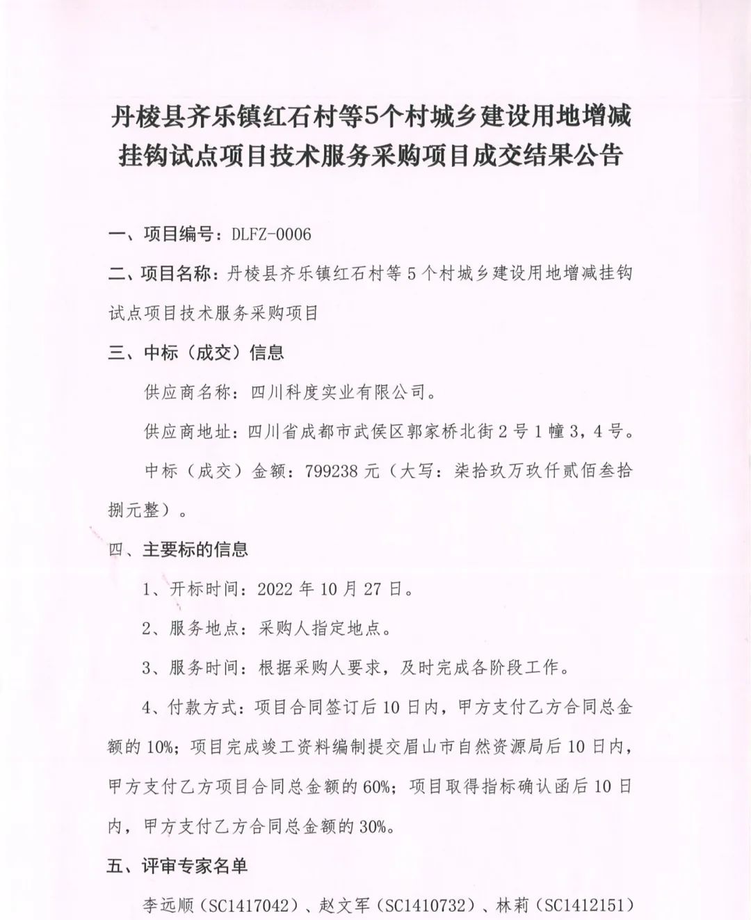 丹棱縣齊樂(lè)鎮(zhèn)紅石村等5個(gè)村城鄉(xiāng)建設(shè)用地增減掛鉤試點(diǎn)項(xiàng)目技術(shù)服務(wù)采購(gòu)項(xiàng)目成交結(jié)果公告