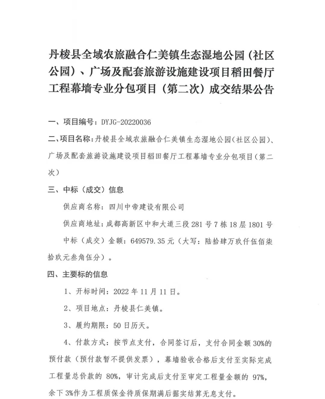 丹棱縣全域農(nóng)旅融合仁美鎮(zhèn)生態(tài)濕地公園(社區(qū)公園)、廣場及配套旅游設(shè)施建設(shè)項(xiàng)目稻田餐廳工程幕墻專業(yè)分包(第二次)成交結(jié)果公告