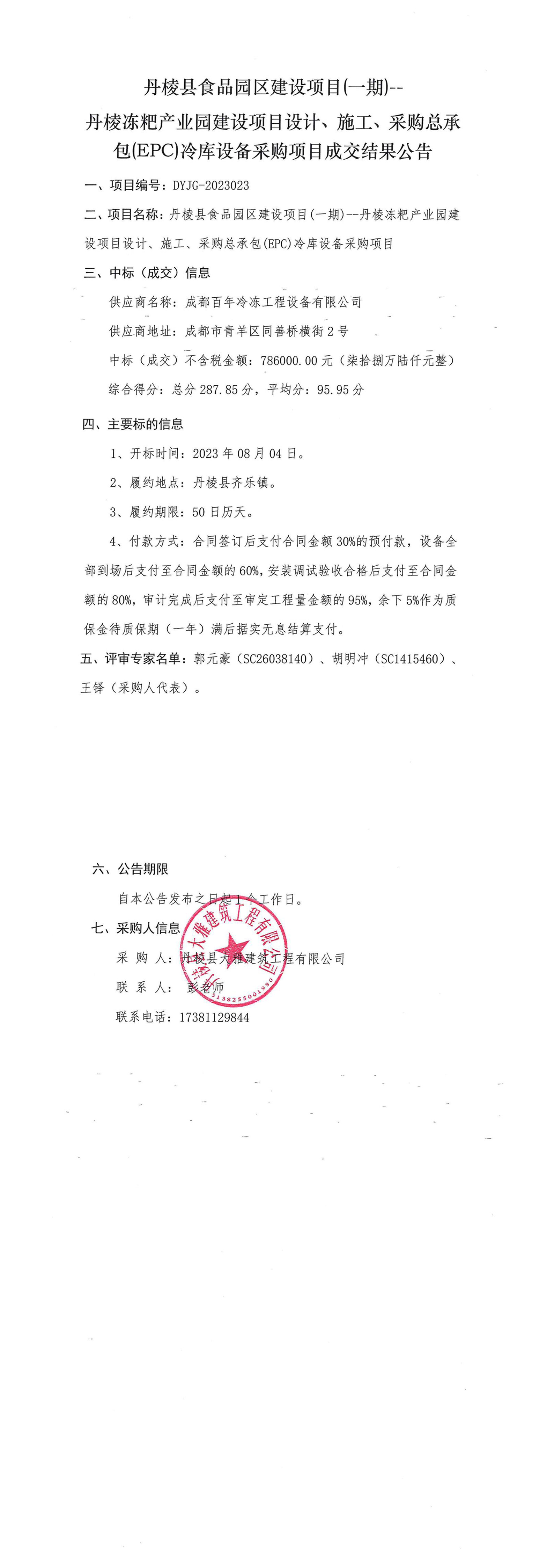 丹棱縣食品園區(qū)建設(shè)項(xiàng)目(一期)--丹棱凍粑產(chǎn)業(yè)園建設(shè)項(xiàng)目設(shè)計(jì)、施工、采購總承包(EPC)冷庫設(shè)備采購項(xiàng)目成交結(jié)果公告