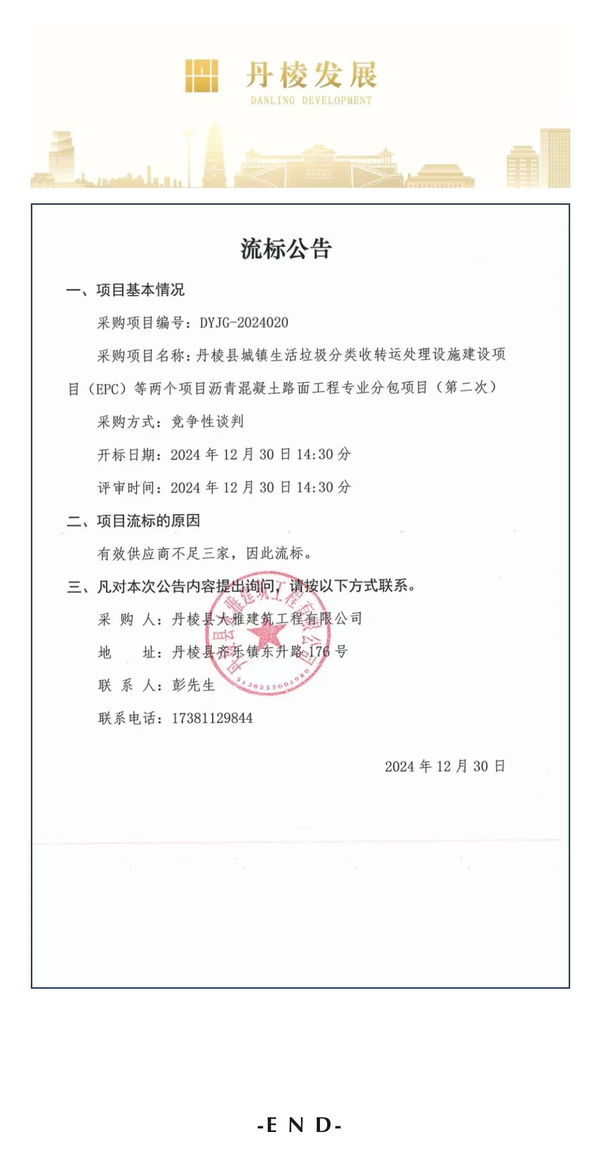 丹棱縣城鎮(zhèn)生活垃圾分類收轉運處理設施建設項目(EPC)等兩個項目瀝青混凝土路面工程專業(yè)分包項目(第二次)流標公告