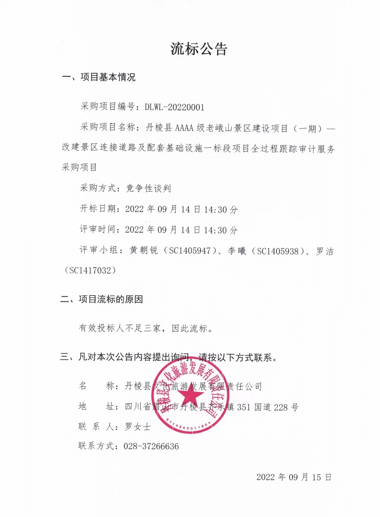 丹棱縣AAAA級(jí)老峨山景區(qū)建設(shè)項(xiàng)目(一期)--改建景區(qū)連接道路及配套基礎(chǔ)設(shè)施一標(biāo)段項(xiàng)目全過程跟蹤審計(jì)服務(wù)采購項(xiàng)目流標(biāo)公告