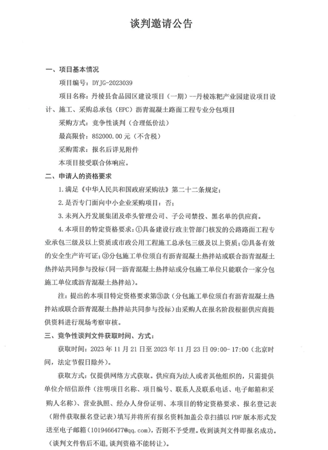 丹棱縣食品園區(qū)建設(shè)項(xiàng)目(一期)—丹棱凍粑產(chǎn)業(yè)園建設(shè)項(xiàng)目設(shè)計(jì)、施工、采購總承包(EPC)瀝青混凝土路面工程專業(yè)分包項(xiàng)目談判邀請公告