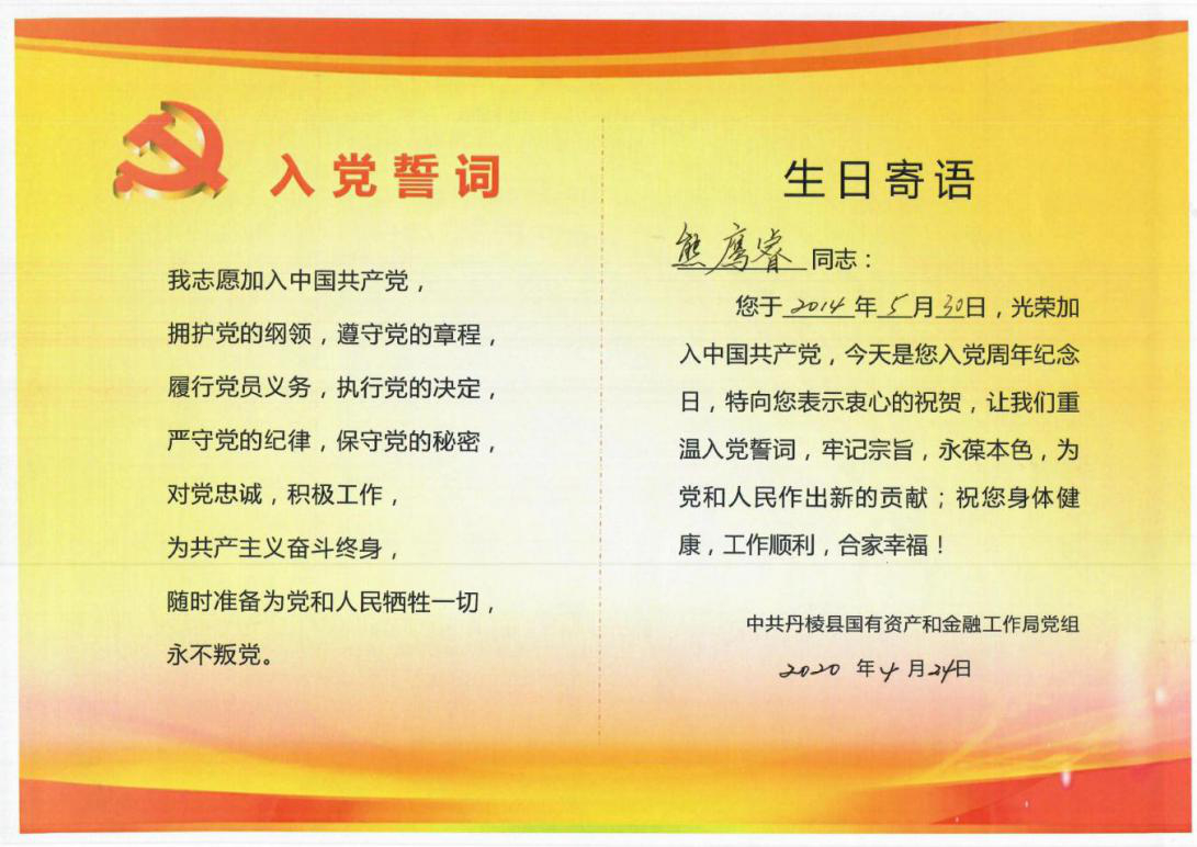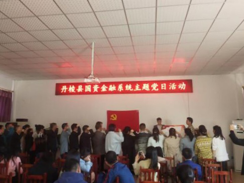 工作安排后,縣國資金融局黨組集體為5月入黨黨員過政治生日,縣國資金融局(縣金融服務(wù)中心)副主任茍永慶同志為“過生日”的黨員們送上精心制作的“黨員政治生日卡”,勉勵黨員同志要“常思入黨初衷、銘記入黨誓詞、牢記黨員義務(wù)”,發(fā)揮黨員先鋒模范作用,在今后的工作中不斷創(chuàng)先爭優(yōu),做好表率;顒幼詈螅w黨員同志在縣國資金融局黨組成員、副局長潘國榮同志的帶領(lǐng)下重溫入黨誓詞、面對黨旗莊嚴(yán)宣誓。